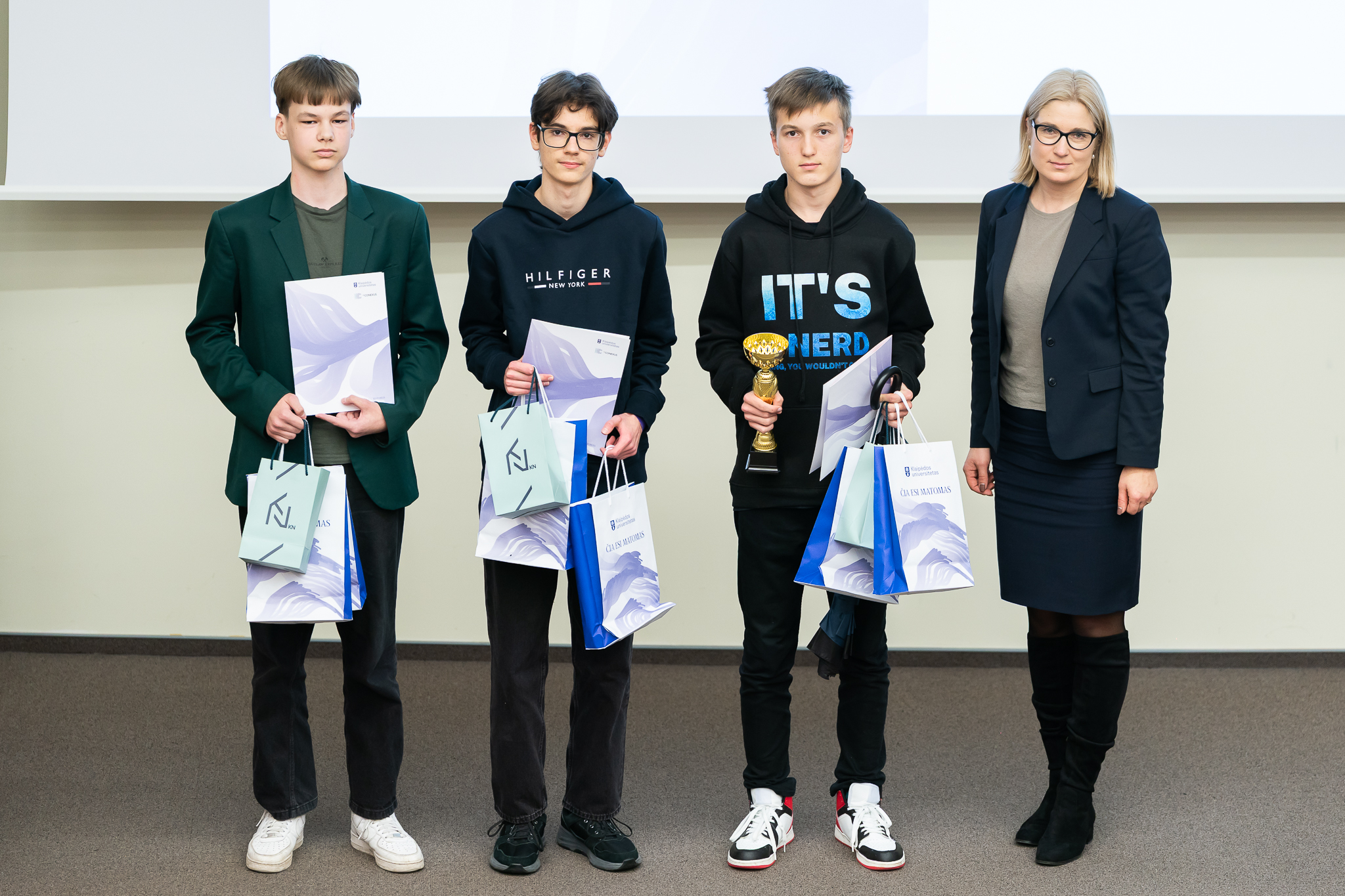 Prizines vietas užėmę mokiniai ir juos paruošę mokytojai gavo ne tik pagrindinio renginio organizatoriaus – Klaipėdos universiteto – prizus, bet ir olimpiados rėmėjų Lietuvos matematikų draugijos, Valstybės duomenų agentūros bei AB „KN Energies“ dovanas.