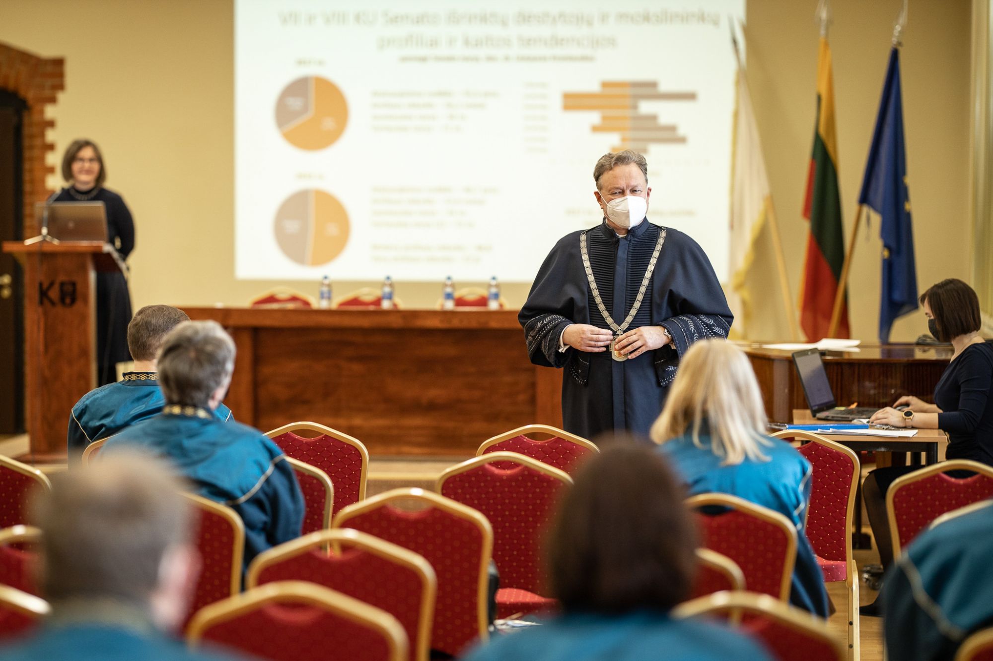 Pirmajame susirinkime naujai išrinktiems jo nariams įteikti jų statusą liudijantys pažymėjimai, įvyko Senato pirmininko bei pavaduotojo rinkimai. Į Senato pirmininko pareigas buvo pasiūlytas tik vienas kandidatas – prof. dr. Vaidutis Laurėnas, ėjęs ir VII-ojo KU Senato pareigas. „Kai yra labai gerai, nereikia ieškoti dar geriau, nes galima nueiti iki suskilusios geldos. Siūlau prof. dr. Vaidutį Laurėną. Jo vadovaujamas Senatas pastaruosius metus dirbo sklandžiai, darbas nesustojo net per pandemiją“,- vienintelę kandidatūrą į Senato pirmininkus pristatė Senato narys prof. Rimantas Balsys. Slaptame balsavime prof. dr. Vaidutis Laurėnas surinko daugumą balsų. Pirmininko pavaduotoju vienbalsiai išrinktas dr. Vytautas Jokubauskas, pastaruosius trejus metus taip pat dirbęs VII-ojo Senato vadovo komandoje. Senato nuolatinių komisijų vadovais patvirtinti dr. A. Senulis, prof. dr. V. Denisovas, doc. dr. A. Rauckienė-Michaellson, dr. A. Norvilienė.