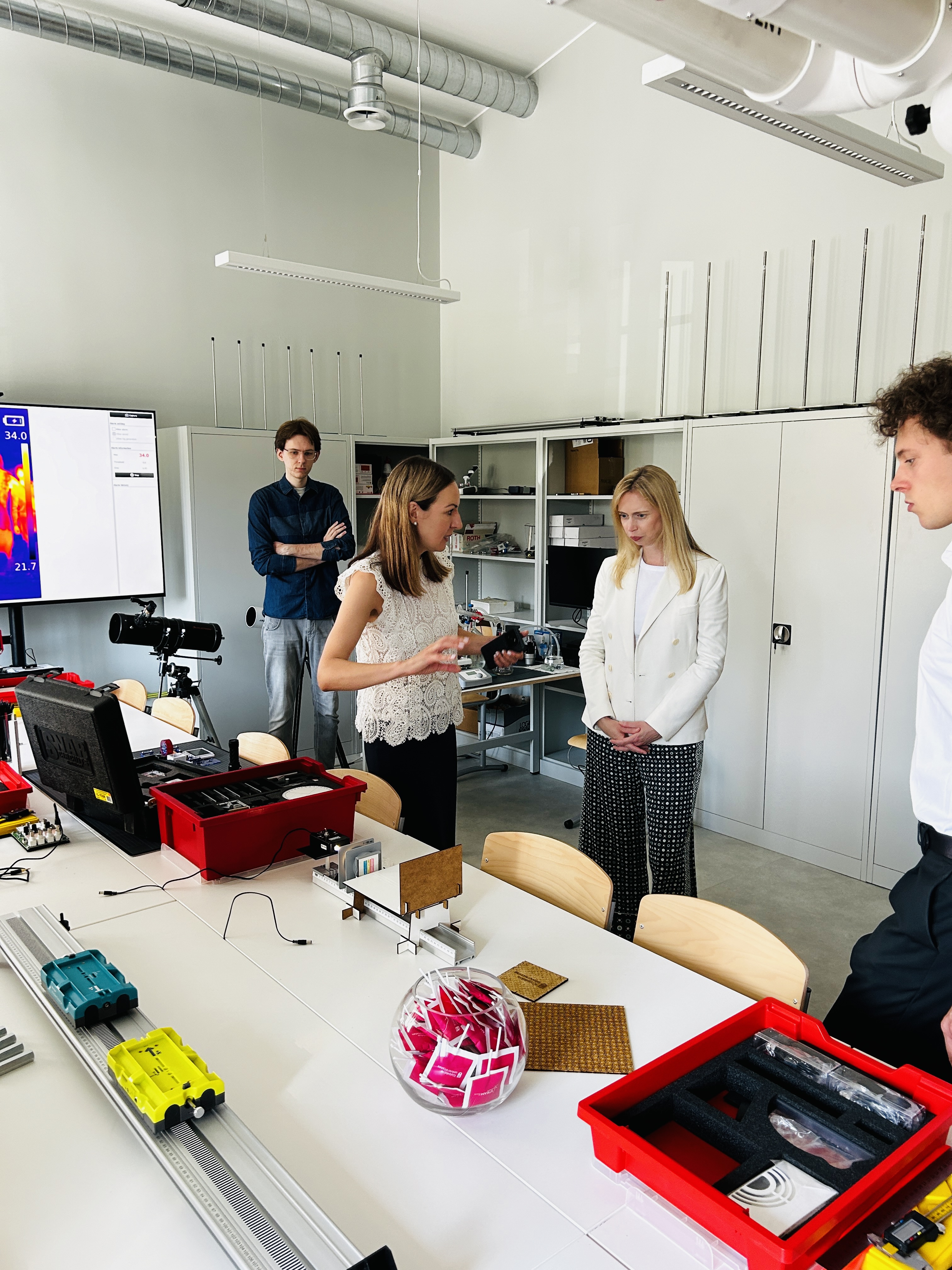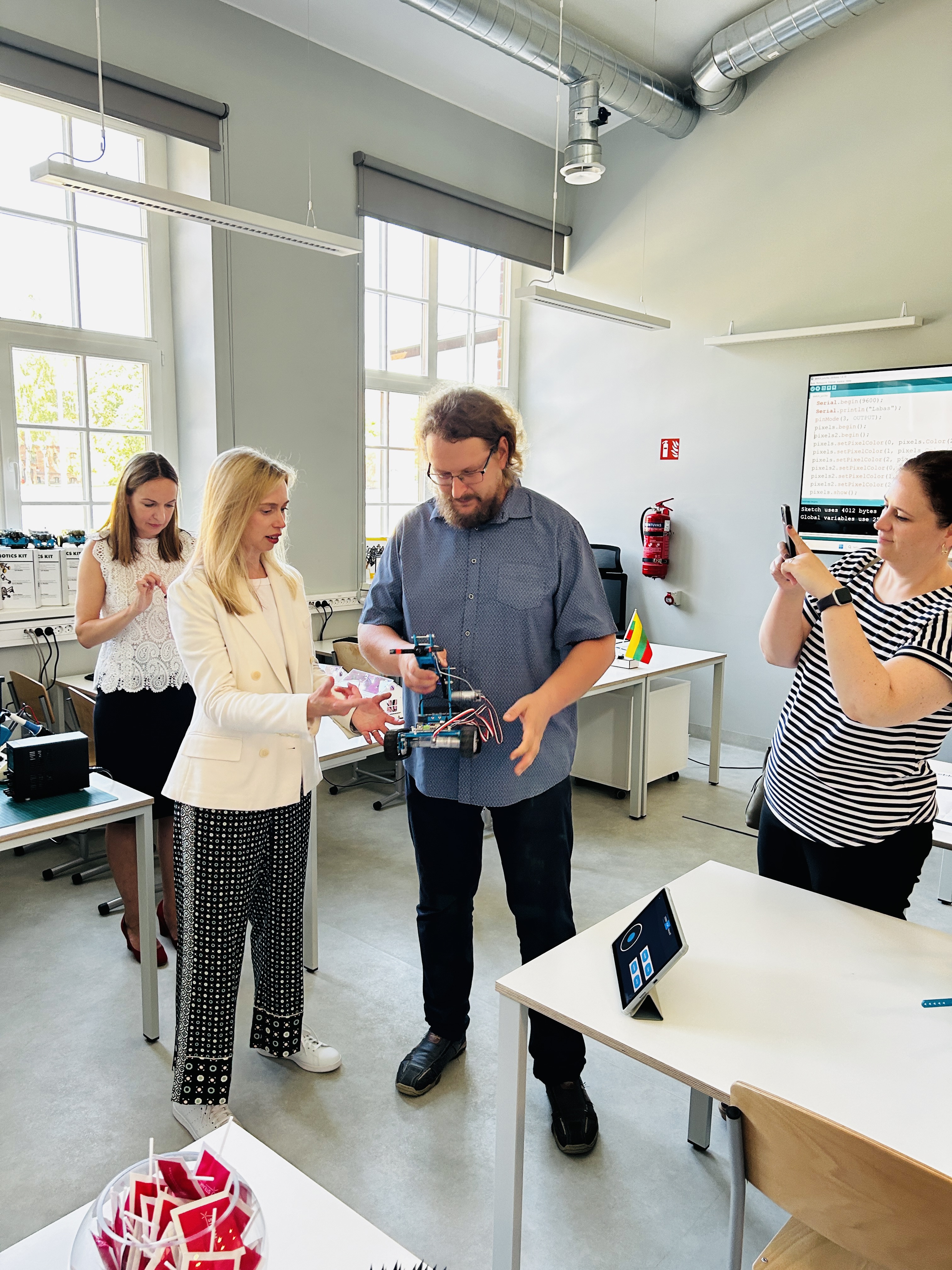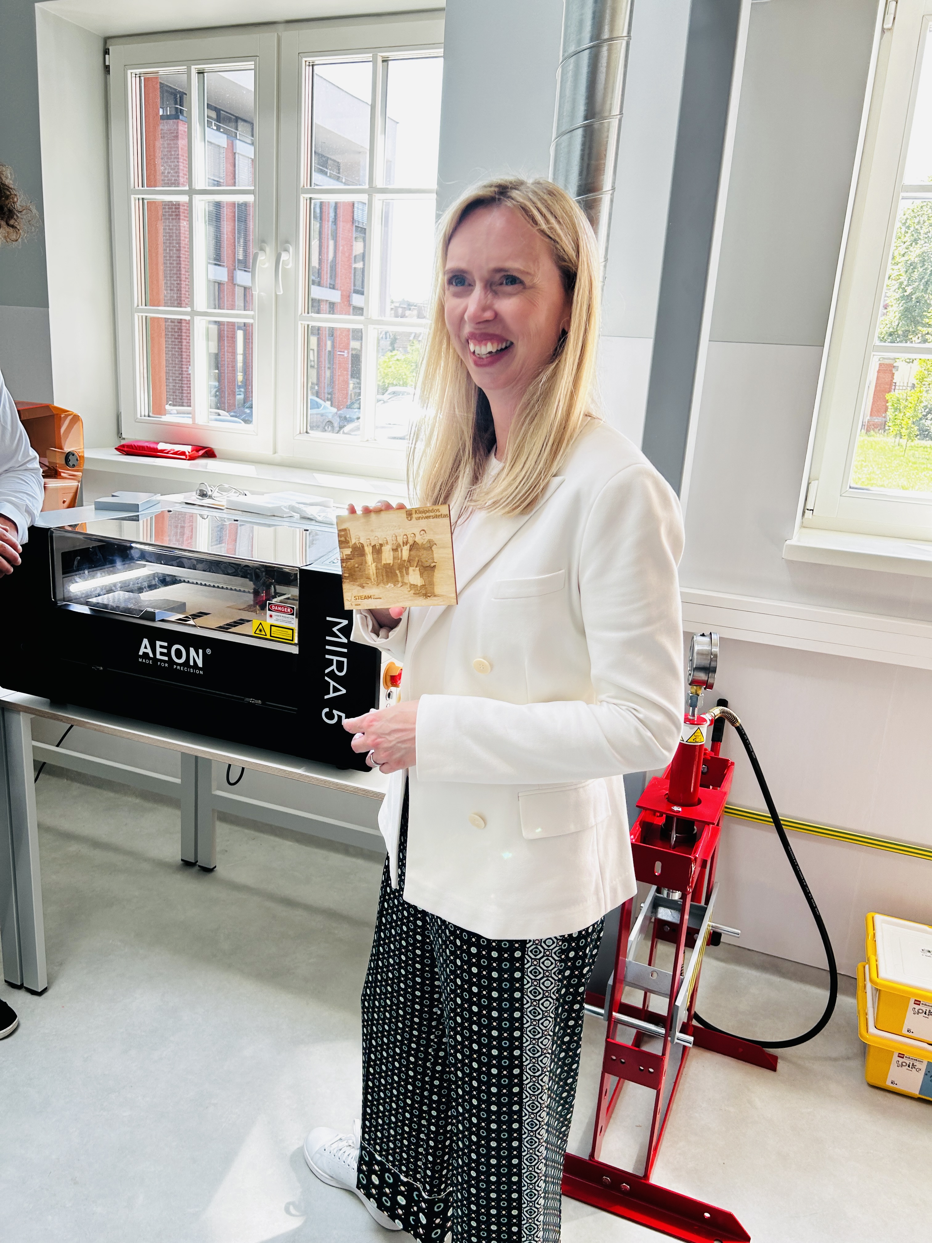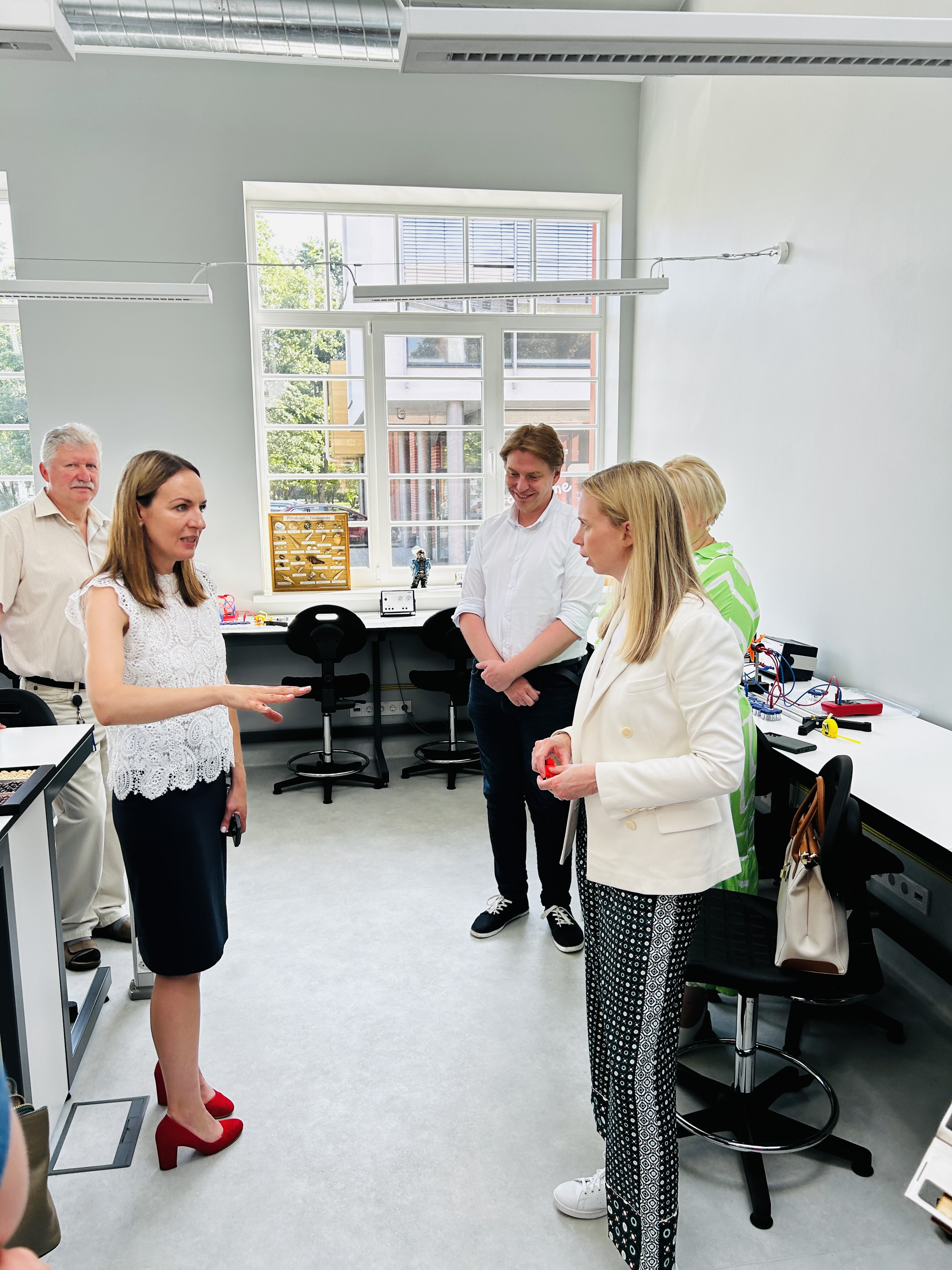 Delegacija taip pat lankėsi kiek daugiau nei prieš du mėnesius atidarytame naujame KU padalinyje – metodiniame STEAM centre – kur svečiams buvo surengtos įvairios demonstracijos ir bendra diskusija. JAV ambasadorę itin domina STEM ir STEAM ugdymo Lietuvoje tematika bei mergaičių į(si)traukimo į tokio ugdymo veiklas klausimai, todėl susitikime dalyvavo ne tik STEAM centro metodininkai ir laborantai, bet ir ugdymo įstaigų atstovai – Klaipėdos universiteto „Žemynos“ gimnazijos ir Klaipėdos „Vyturio“ progimnazijos direktoriai ir mokiniai.