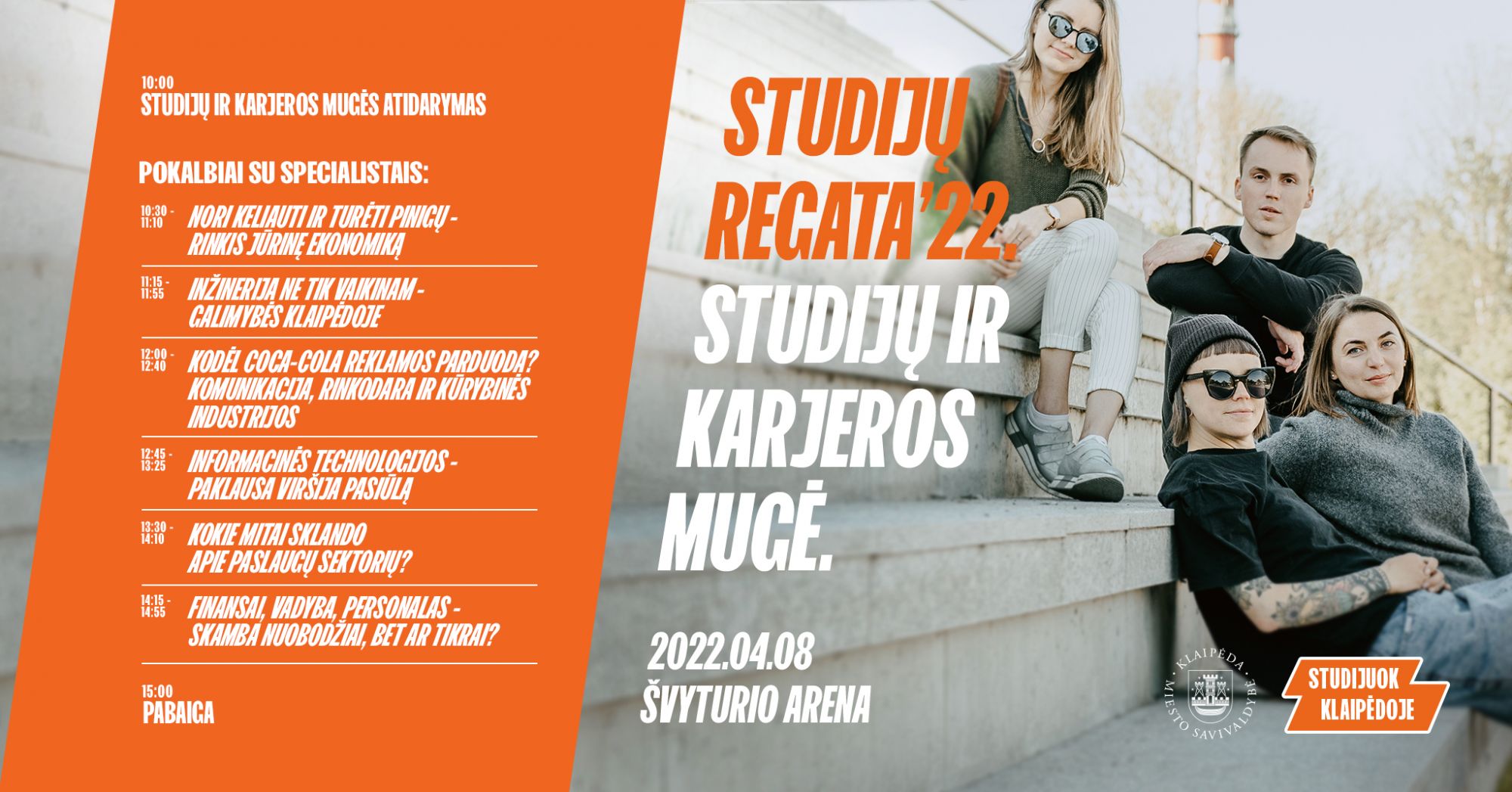 7-ą kartą Klaipėdoje vyksianti Studijų ir karjeros mugė „Studijų regata‘22” išsiskiria ir tuo, jog joje aktyviai dalyvauja ir verslo, t.y. būsimųjų jaunimo darbdavių atstovai. Tad į renginį atėjusiam jaunuoliui nesudėtinga sudėlioti ateities viziją – nuo pasirinktos studijų krypties ar konkrečios programos iki potencialios darbo vietos ir jos teikiamų galimybių. Mugės programoje numatytos net 7 diskusijos su skirtingų verslo sričių atstovais.