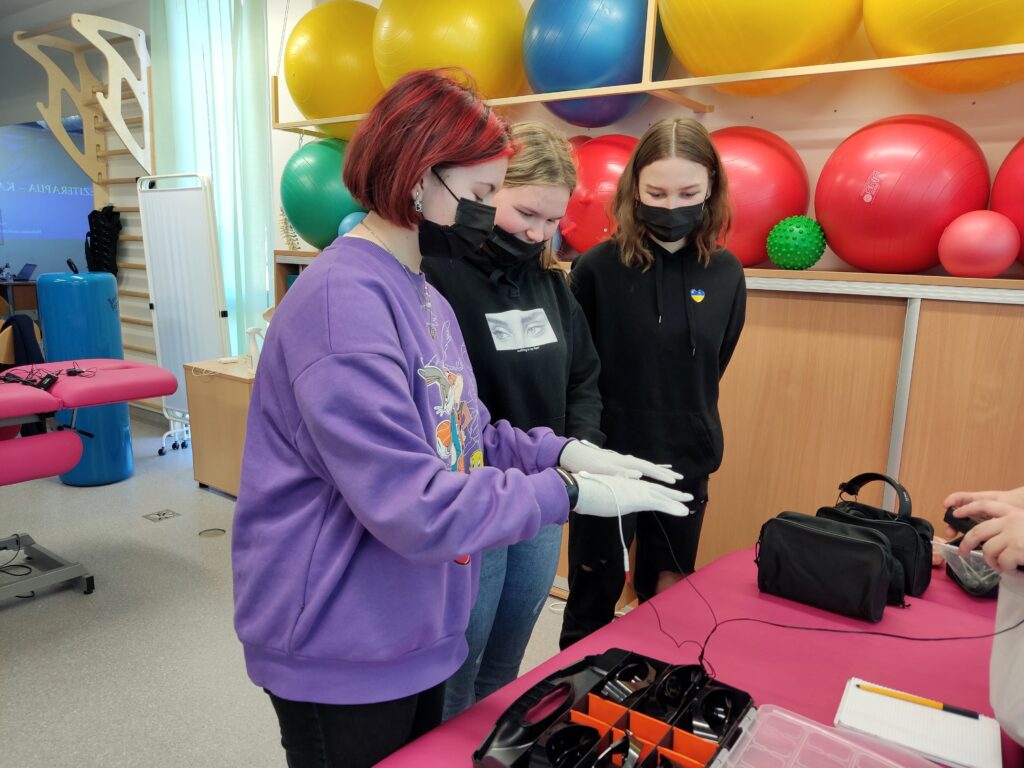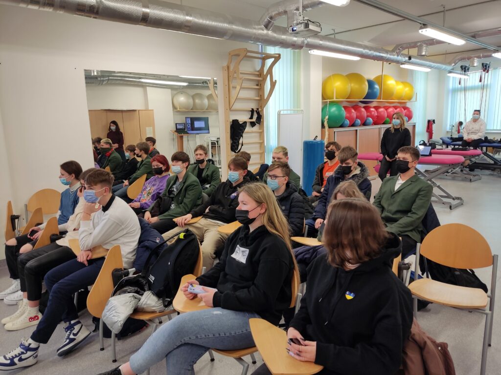 Po Robotikos edukacijų 1a, 1c ir 1e klasės ėjo į Klaipėdos universiteto Sveikatos mokslų fakulteto dėstytojų parengtą edukacinį susipažinimą. Čia mokiniai turėjo galimybę ne tik susipažinti su teorine medžiaga, bet ir patys išbandyti įvairią praktinę reabilitacinę įrangą. Mokiniai su prietaisais išsimatavo savo jėgą, kompiuterio ekrane stebėjo savo vikrumą, išbandė Parkinsono ligą imituojančias pirštines bei akinius, kurie perteikia įvairius regėjimo sutrikimus, naudojo svarmenis, kad pajustų, ką reiškia senam žmogui atsikelti iš lovos. Visus šiuos prietaisus demonstravo ir apie įvairius sveikatos sutrikimus pasakojo KU Sveikatos mokslų fakulteto Holistinės medicinos ir reabilitacijos katedros vedėja prof. dr. Daiva Mockevičienė, kuriai talkino laborantės Roma Urbonienė, Rita Gikarienė ir katedros sekretorė Kornelija Mažionytė. Šis edukacinis supažindinimas su įranga ir jos praktinis panaudojimas jauniesiems gimnazistams leidžia ugdyti empatijos jausmą, atjausti ir suprasti negalią turinčius žmones.