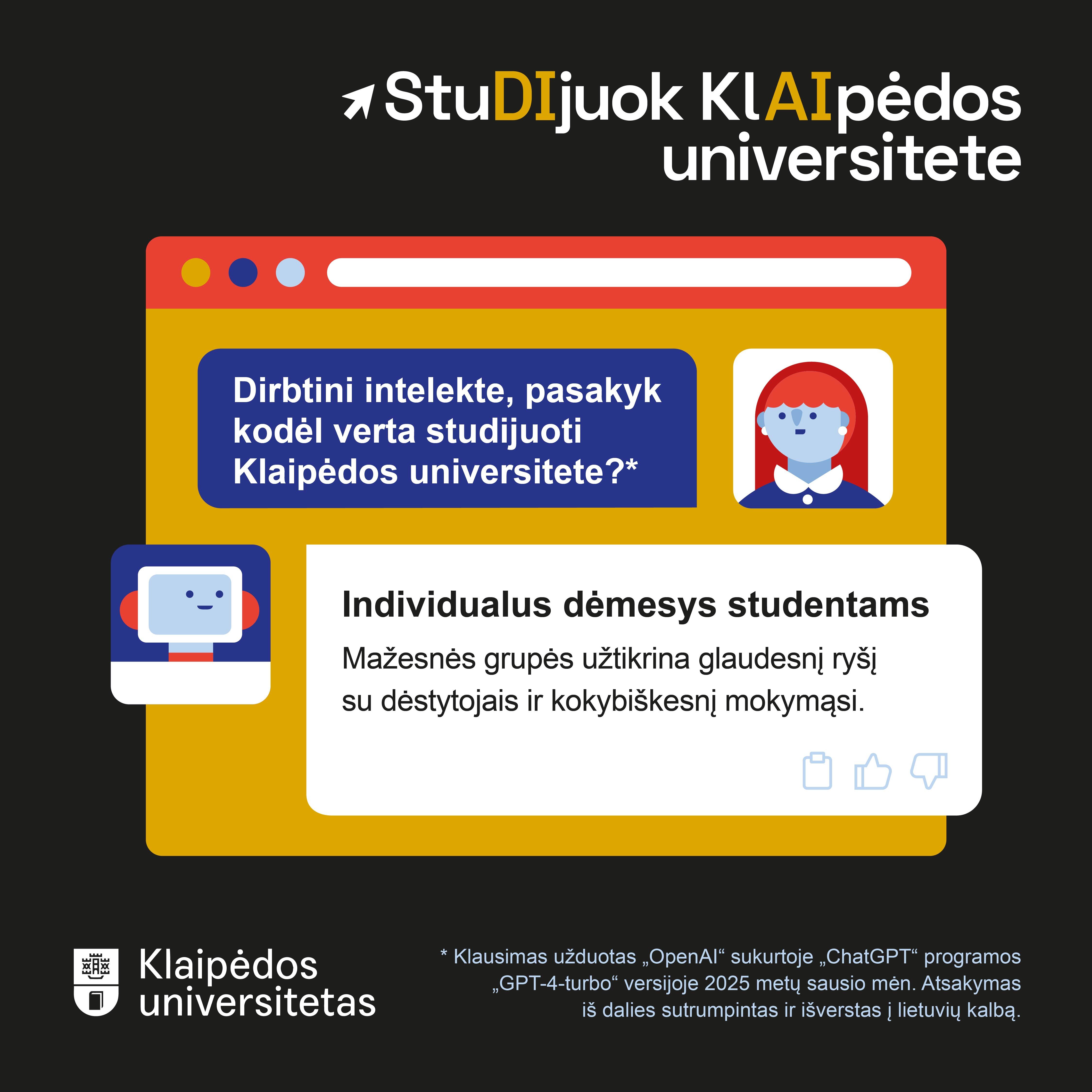 „Šiandieniniame pasaulyje svarbu ne tik įgyti žinių, bet ir išmokti mąstyti kritiškai, kelti drąsius klausimus bei ieškoti atsakymų į globalius iššūkius. Naujoji kampanija, paremta dialogu su dirbtiniu intelektu, puikiai atspindi Klaipėdos universiteto tikslą – jaunus žmones skatinti mąstyti savarankiškai ir atvirai. Kviečiame būsimus studentus drąsiai klausti, pažinti ir kartu kurti savo ateitį“ – sako KU Komunikacijos ir rinkodaros skyriaus vadovė I. Petrauskienė.