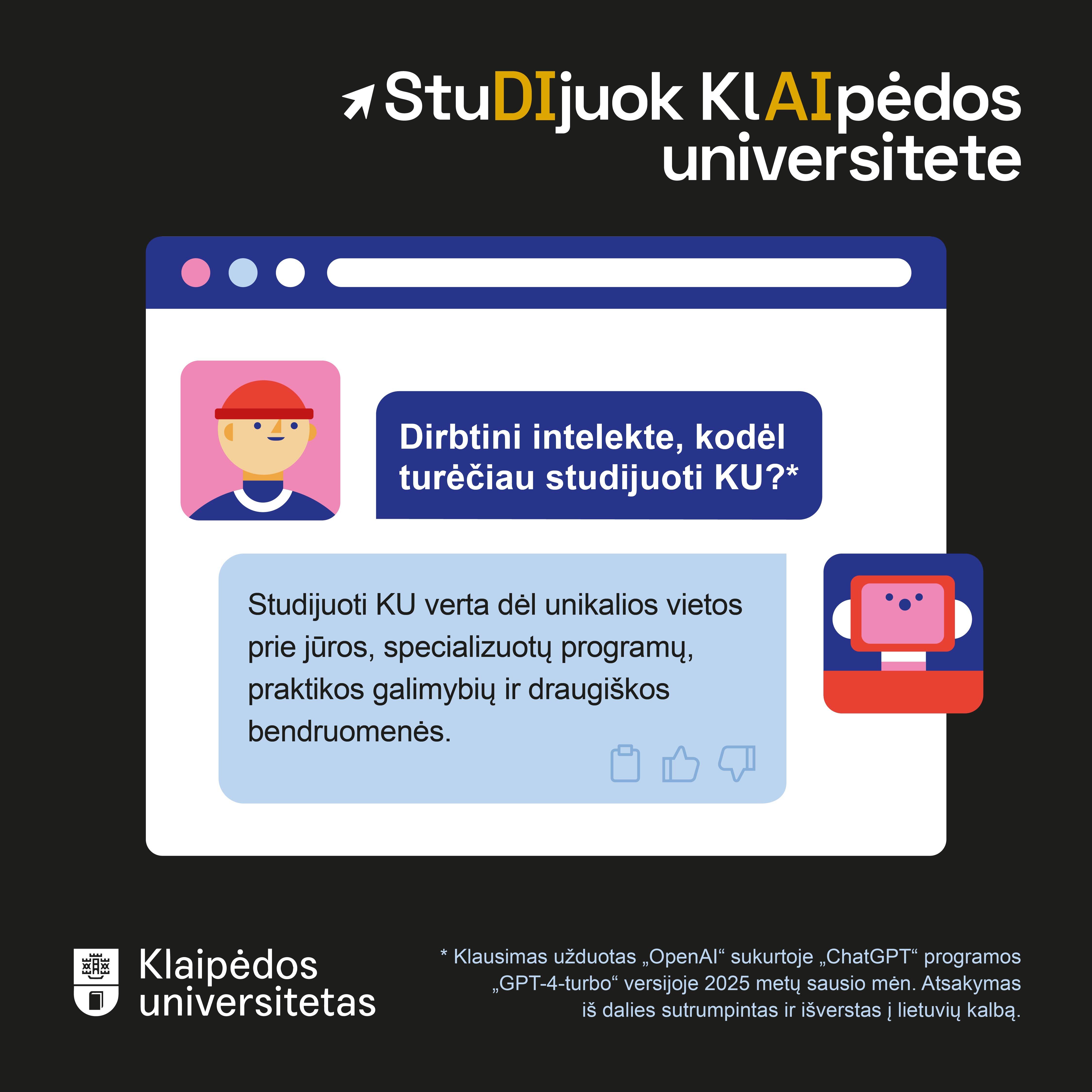 2025-uosius metus Klaipėdos universitetas (KU) pradeda su nauja studijų rinkodaros kampanija „StuDIjuok KlAIpėdos universitete“ ir į jaunus, savo profesinio kelio ieškančius, žmones kreipiasi šiuolaikinių technologijų kalba. O kas gali būti objektyviau, nešališkiau ir šiuolaikiškiau nei universiteto siūlomų galimybių pristatymas, pateiktas dirbtinio intelekto? Kampanija kviečia būsimus studentus būti smalsiais, besidominčiais, šiuolaikiškais, atvirais, ugdyti kritinį mąstymą, nebijoti pažvelgti į save iš šalies, o svarbiausia – nebijoti klausti.