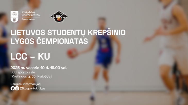 Vasario 10 d. 19.00 val. Lietuvos studentų krepšinio lygos čempionato varžybose Klaipėdos universiteto krepšinio komanda susitiks su LCC Tarptautinio universiteto ekipa.
